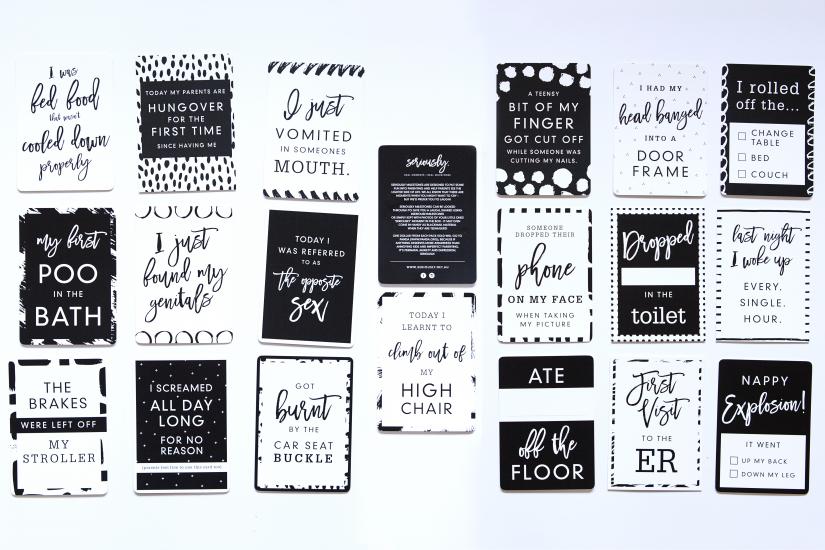 The cards that you get have been picked because they are moments that we know pretty much all parents have been through - or will go through at some point. Because babies don't like to play by the book either, there are a few cards that you can fill in specifically for your situation.